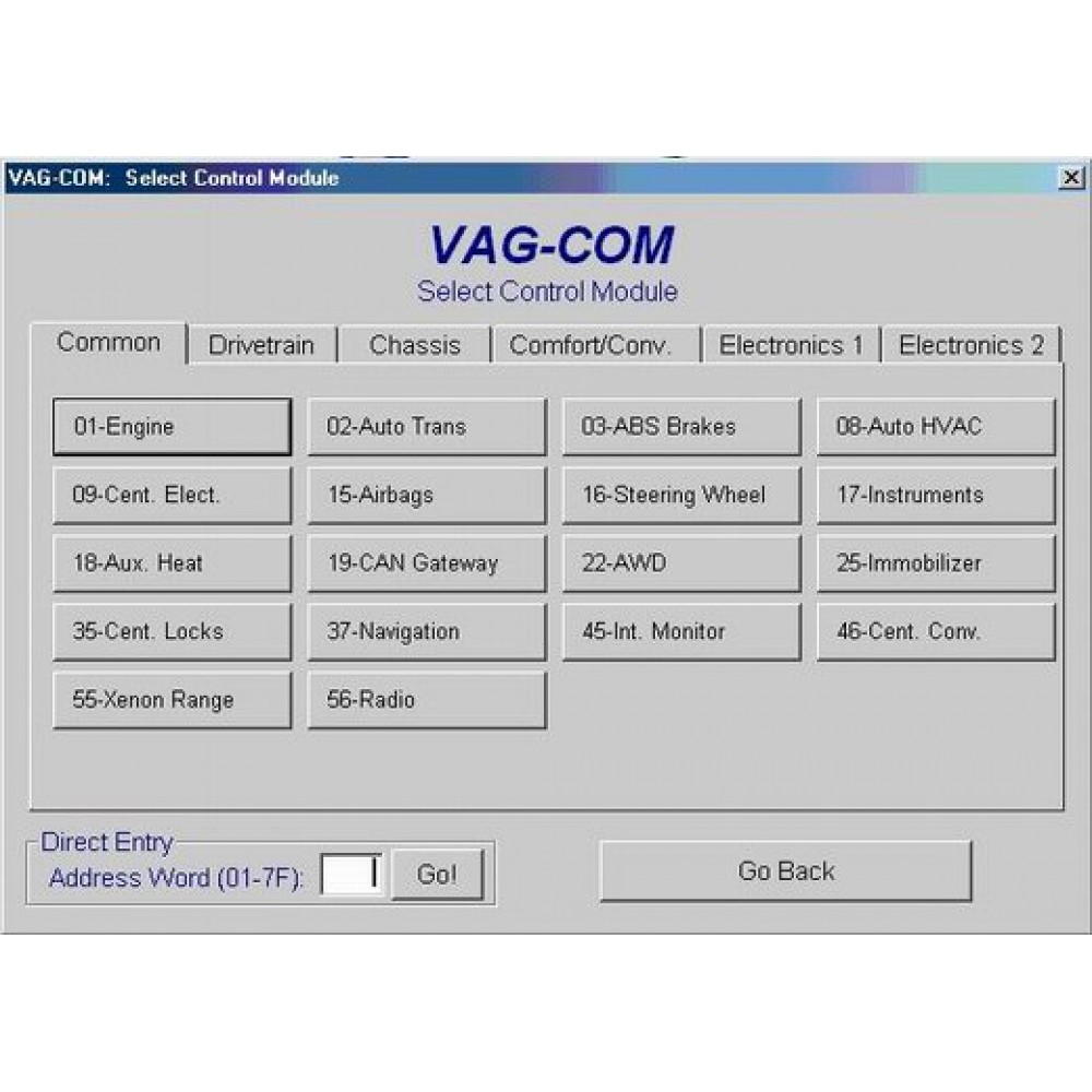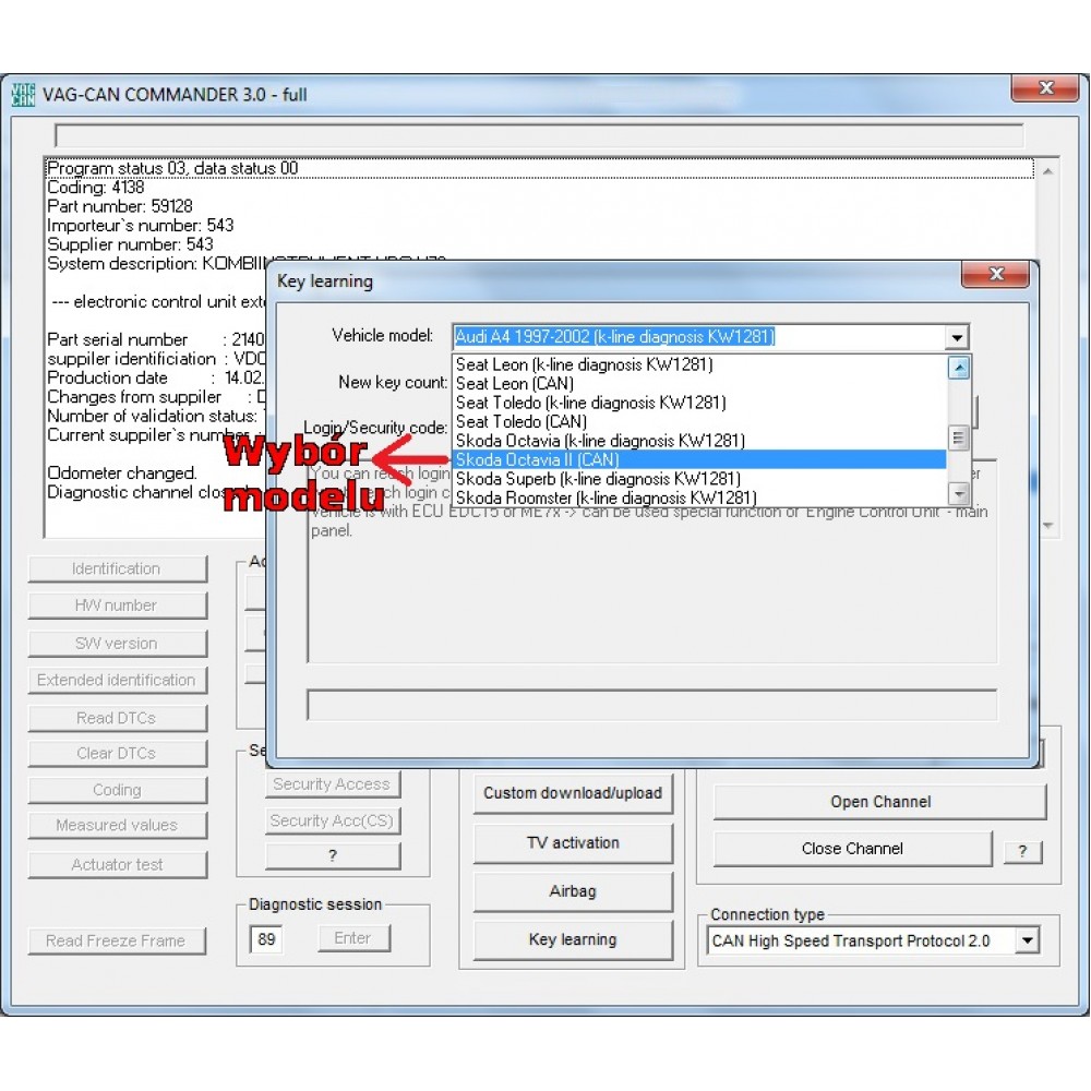 Po uruchomieniu programu wybieramy moduł z którym chcemy się połączyć (może to być sterownik silnika, abs`u, air-bag`u, immobilisera lub każdy inny spośród kilkudziesięciu dostępnych). Gdy dokonamy wyboru odpowiedniego modułu czekamy na zgłoszenie się sterownika.