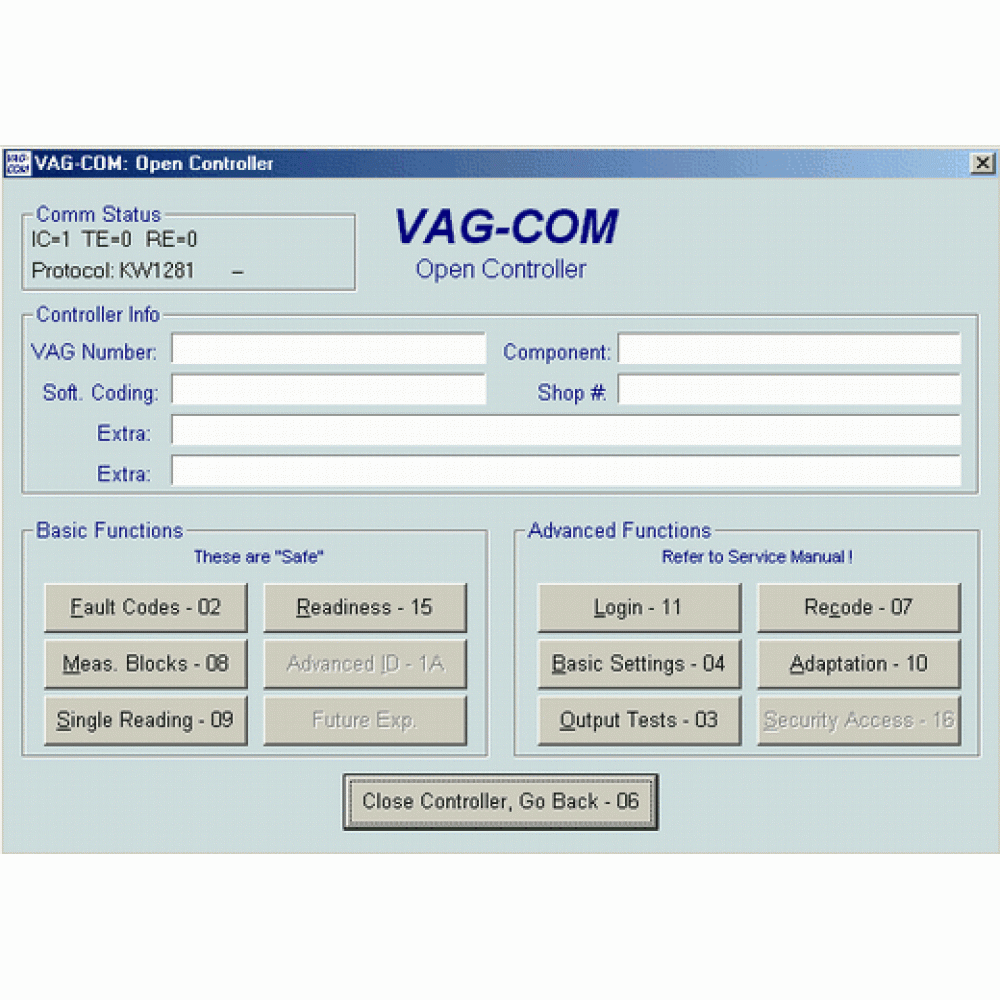 Po połączeniu ze sterownikiem można wybrać interesujące nas funkcje podstawowe (np. odczyt kodów usterek, bloki pomiarowe, pojedynczy odczyt), lub funkcje zaawansowane (np. kodowanie, nastawy podstawowe, przeprowadzanie adaptacji elementów wykonawczych, test elementów wykonawczych).