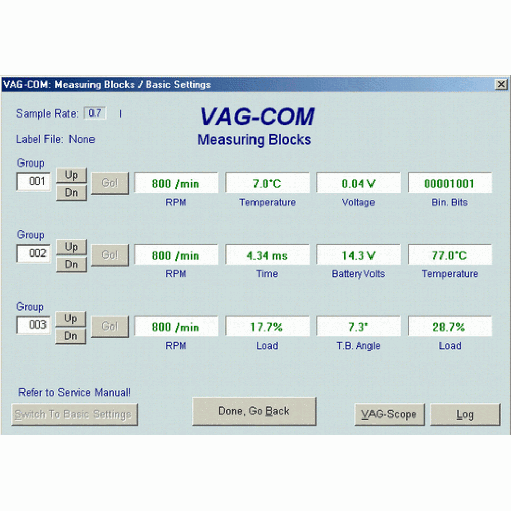 Na poniższym rysunku przedstawiono działanie funkcji "Bloki pomiarowe". Diagnozowane auto to Skoda Octavia 1.6 `99r. W ten prosty sposób można sprawdzić każdy samochód koncernu VAG. Wystarczy wsiąść do auta, włączyć program i zrobić próbną jazdę obserwując aktualne parametry pracy.