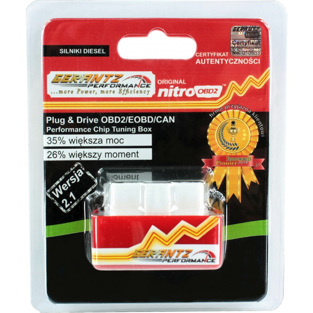 Jest to Chip, który jest podłączany do gniazda OBD2 w celu zwiększenia wydajności pracy silnika pojazdu oraz podniesienia jego parametrów (moc oraz moment obrotowy). Urządzenie to nie przekracza wymagań producenta oraz działa tylko w granicach tolerancji danego silnika. Jest prosty w użyciu i pozwala na całkowicie bezpieczną formę tuningu. Chip Nitro OBD2 to produkt wysokiej jakości, drukowany w technice SMD.